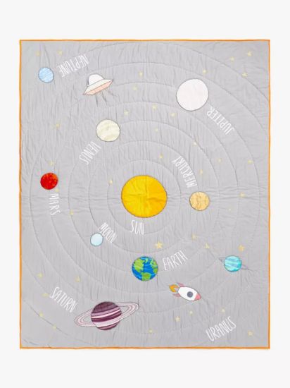 - This cosy quilt is made from pure cotton and is the perfect layer for their bed on chilly nights. With a labelled solar system on one side, they can learn the differences between each planet. The contrasting plain reverse and vibrant trim provides two different design styles for their bedroom.